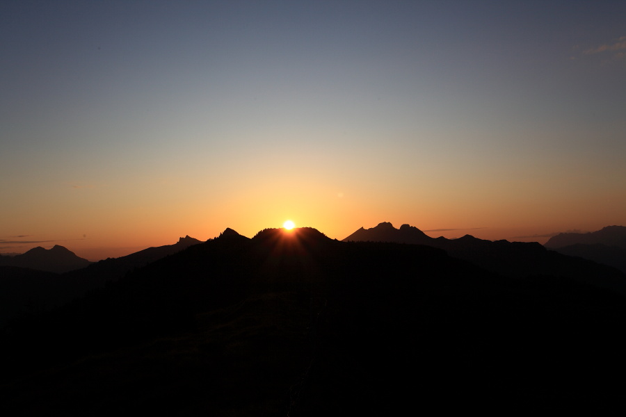Sonnenuntergang über dem Saukarkopf und Karriedl, links der Schuhflicker, rechts die Höllwand.