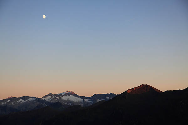 Blick vom Kreuzkogel nach Süden zu Frauenkogel und Ankogel in der letzten Abendsonne.